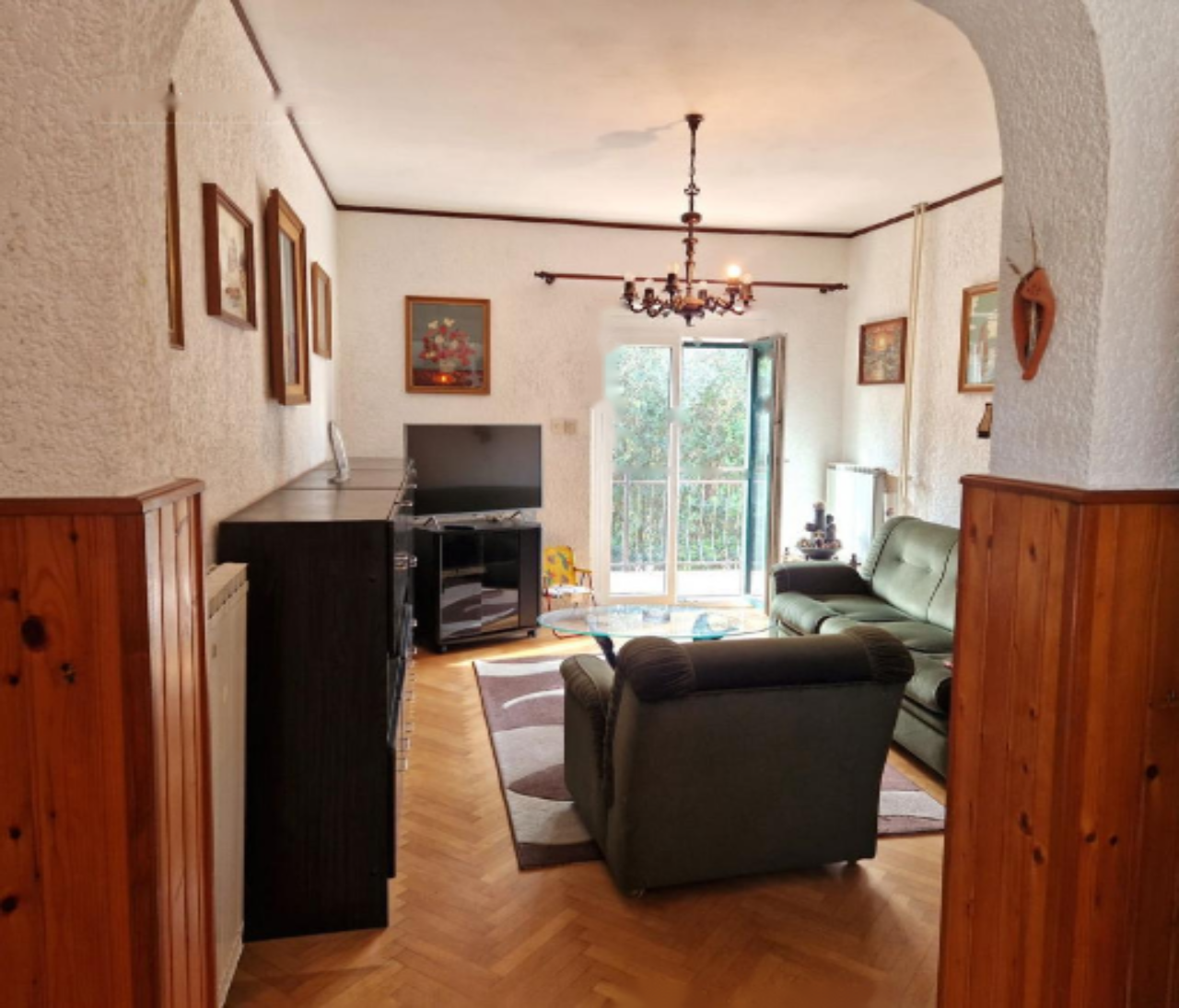 Отопление осуществляется с помощью центральной системы на жидком топливе и камина, что создаёт уютную атмосферу в холодное время года. В 2024 году во всем жилье были заменены окна и ставни, а также обновлена керамическая плитка на балконе, сохраняя при этом классический паркет «ёлочка» в гостиной и спальнях. Однако, квартира требует дальнейшего обновления, что открывает широкие возможности для самовыражения и благоустройства.