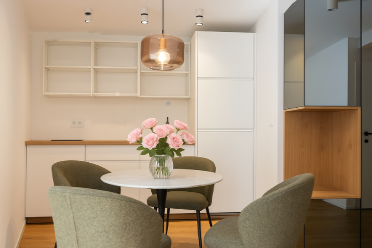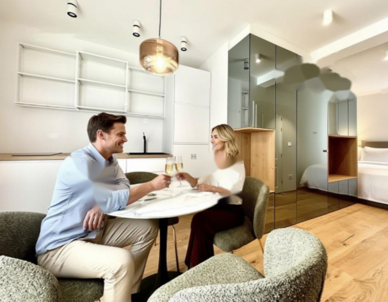 В доме предусмотрено четыре полностью оборудованных апартамента, каждый из которых оснащён собственной ванной комнатой, функциональной кухней и просторной гостиной-спальной зоной. Размеры апартаментов варьируются от 23 до 33 м², что обеспечивает комфортное размещение для двух-четырёх человек. Интерьеры продуманы до мелочей, а мебель под заказ придаёт им элегантность и практичность.