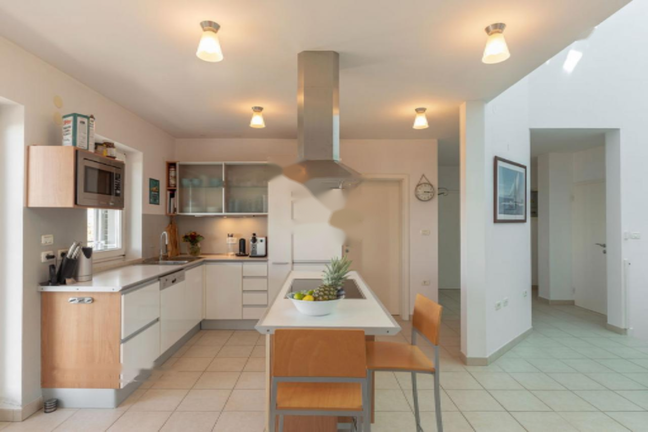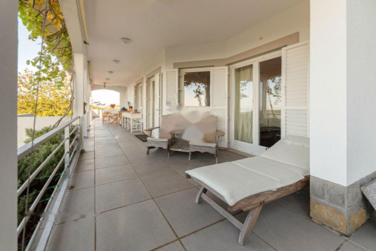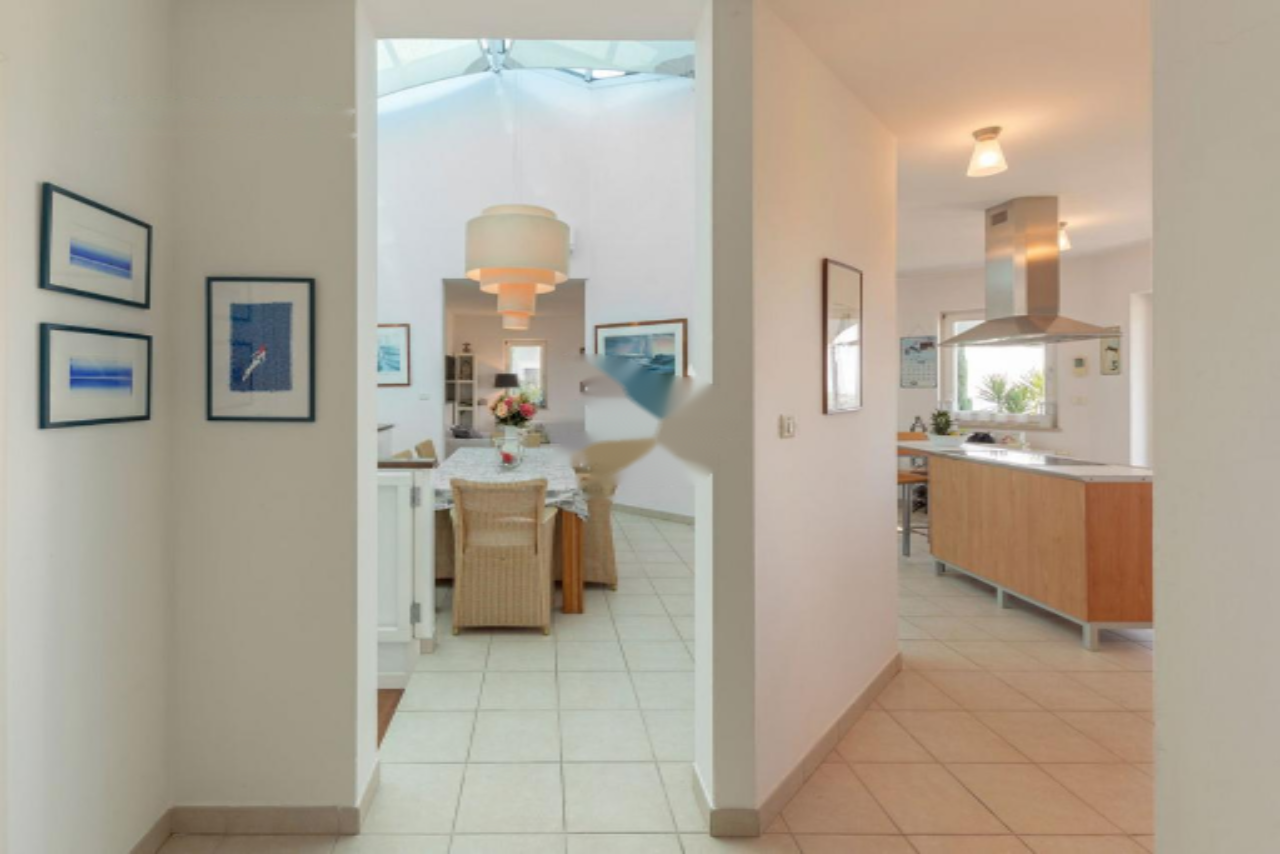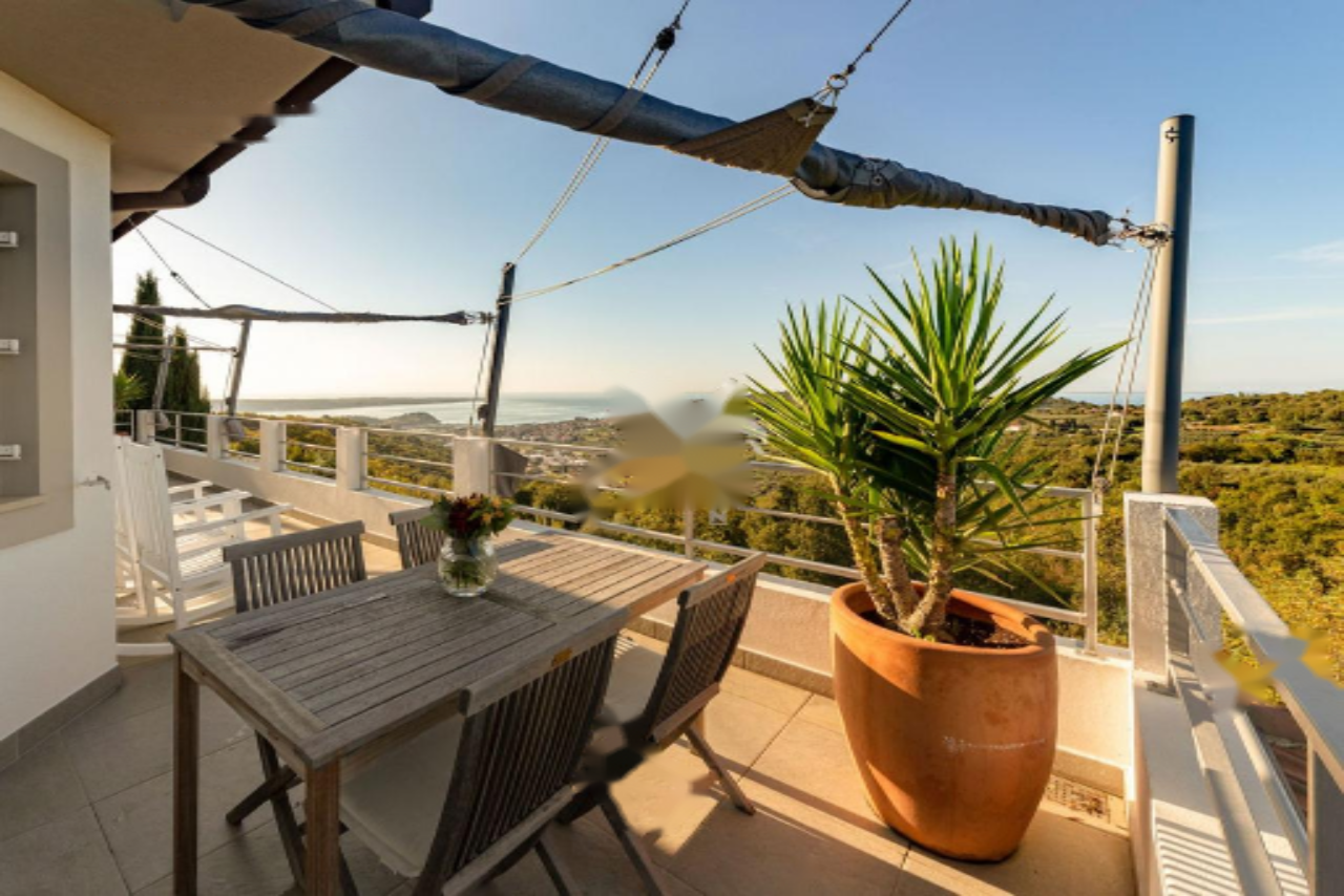 Панорамная терраса протянулась вдоль всей длины дома, предлагая пространство для обеденной зоны на свежем воздухе и лаунж-зону с прекрасными видами на Истру, Градез и Венецию . Нижний этаж включает открытую гостиную зону с кухней и столовой, большую спальню с собственной ванной комнатой, коридор с гардеробом, вторую спальню, дополнительную ванную комнату, спортивный зал (в настоящий момент переоборудован в спальню) с возможностью установки сауны, техническое помещение и небольшую мастерскую, а также крытую террасу с видом, протянувшуюся вдоль всей длины дома.