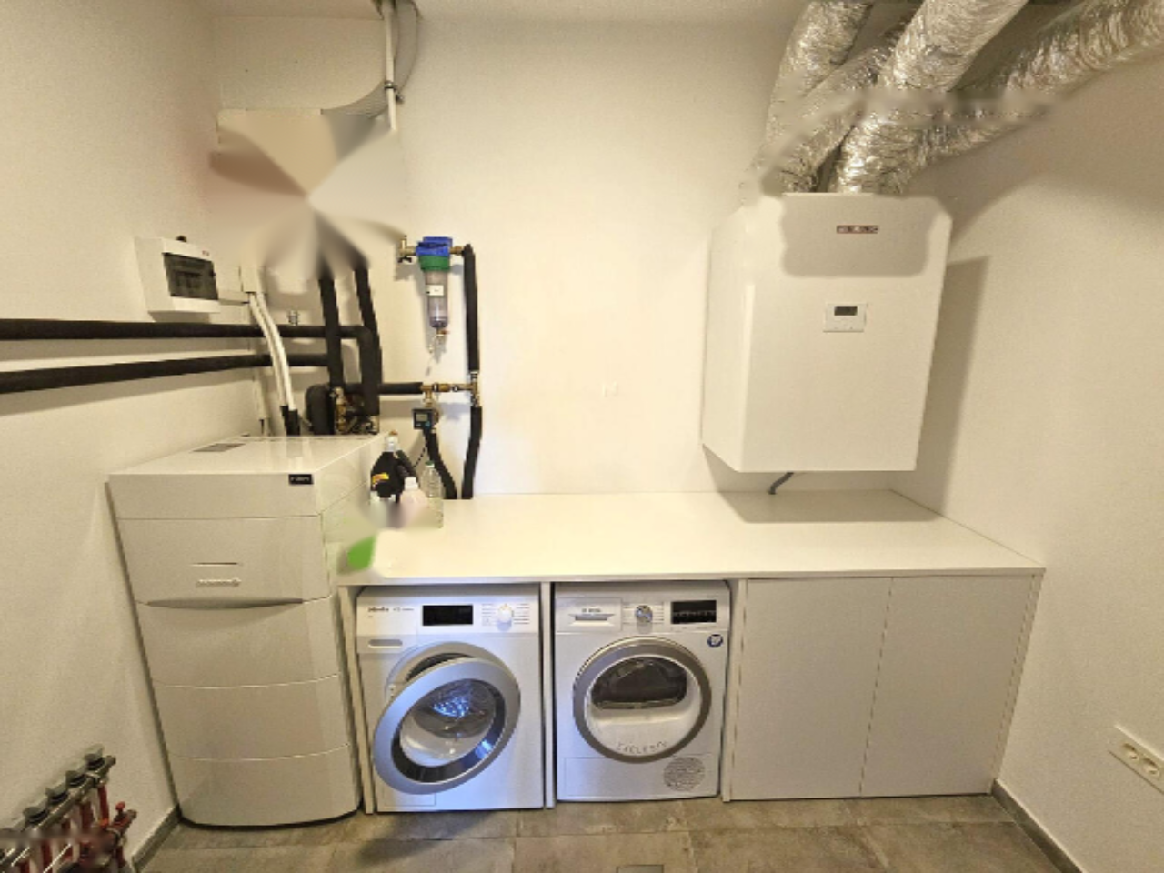 Высокотехнологичное отопление и охлаждение обеспечиваются тепловыми насосами, полами с подогревом и системой рекуперации. Автономное энергоснабжение поддерживается солнечной электростанцией. Дом оснащён умной системой управления, центральным пылесосом и внешней системой полива, что подчёркивает его экстраординарность.
