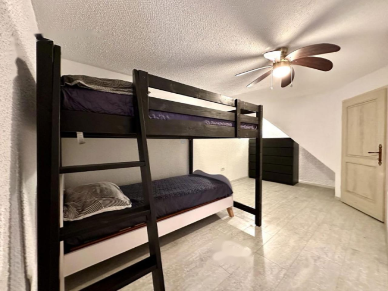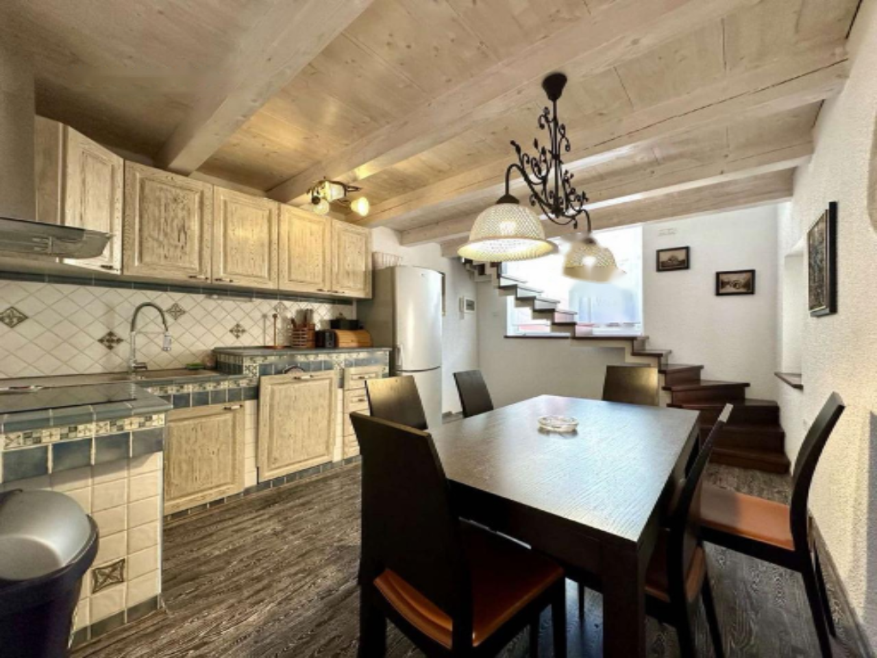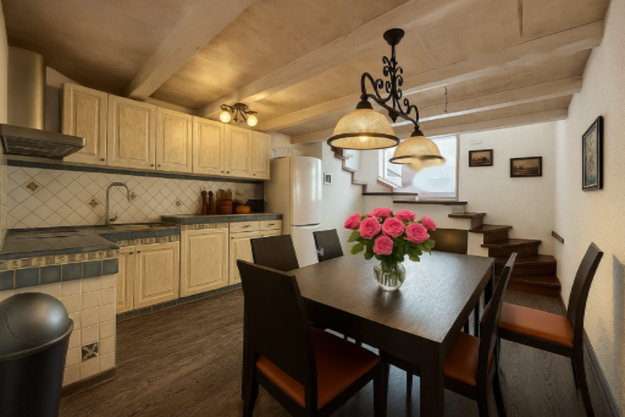 На первом этаже расположены хозяйственная комната, ванная, спальня, кладовая и внутренние лестницы. Второй этаж предлагает две просторные спальни, а третий этаж выделен под кухню, которая изготовлена вручную из качественного дерева. Над ней, на полуэтаже, находится выход на просторную террасу — идеальное место для отдыха или встреч с близкими. Наконец, на мансарде светлая гостиная, связанная с полуэтажом.