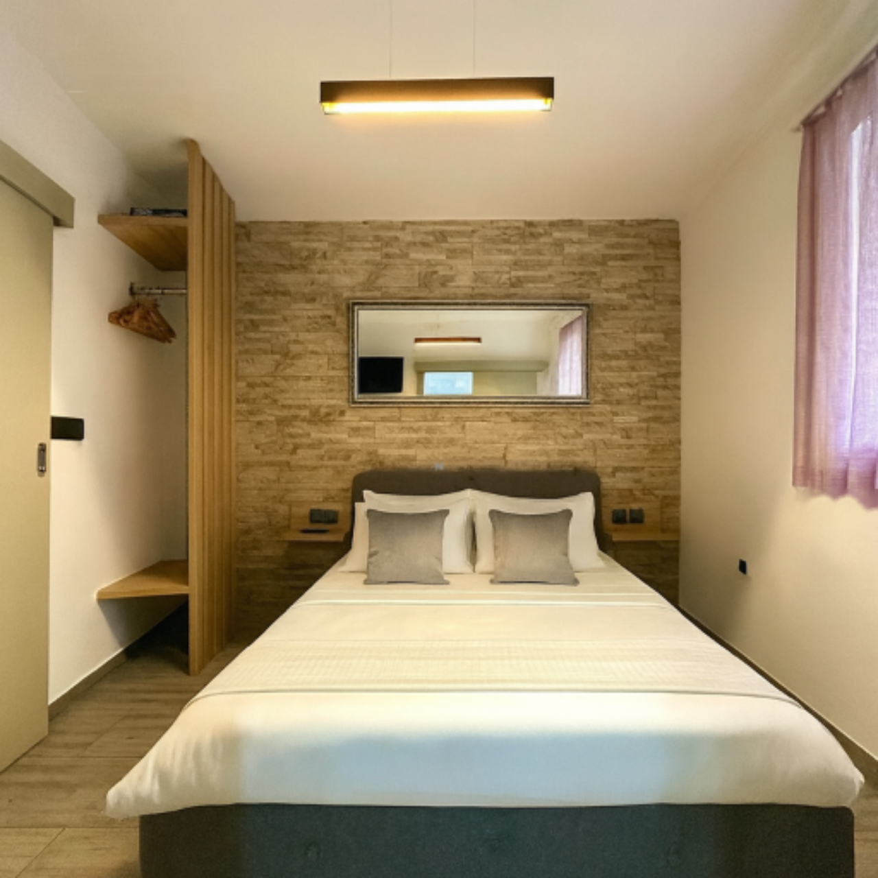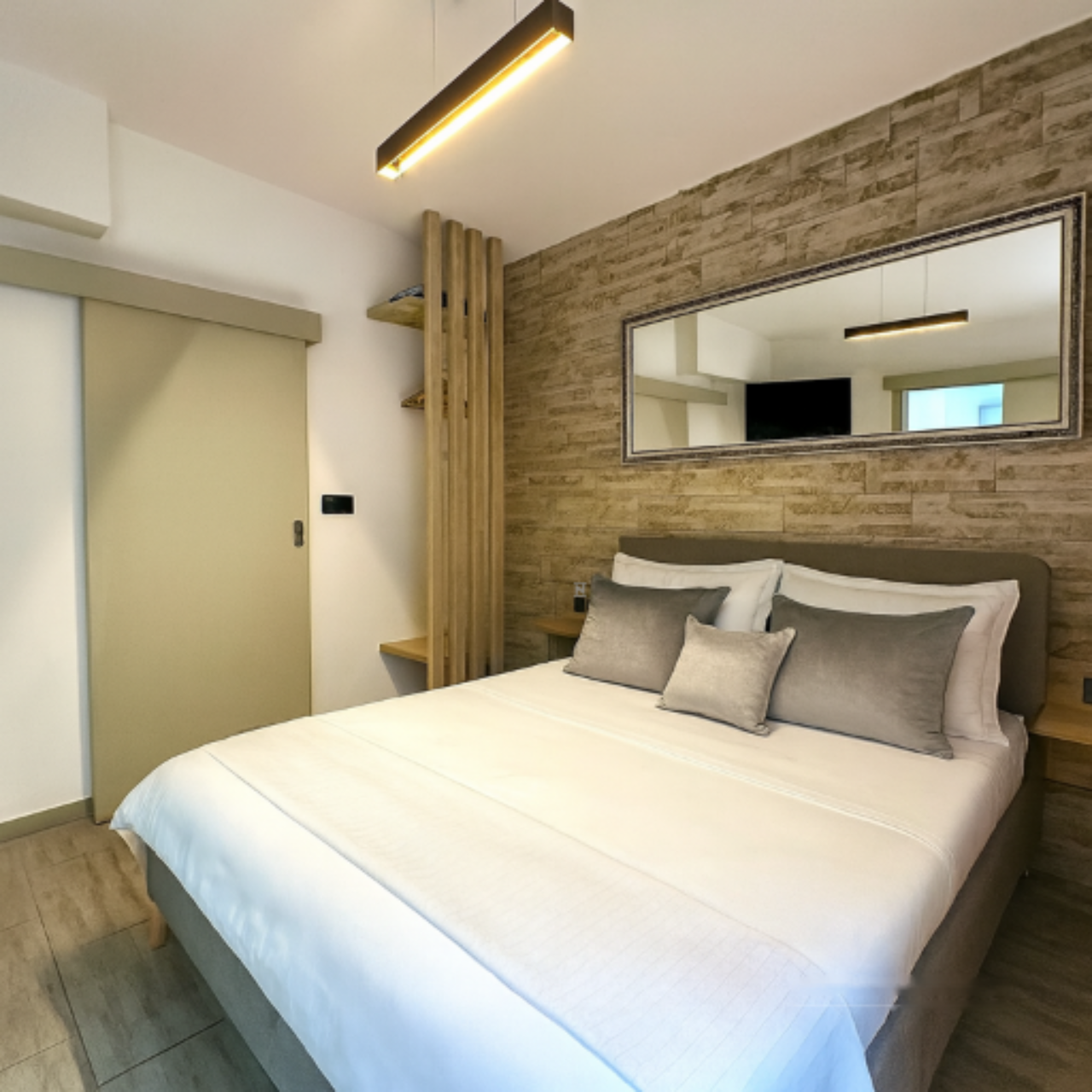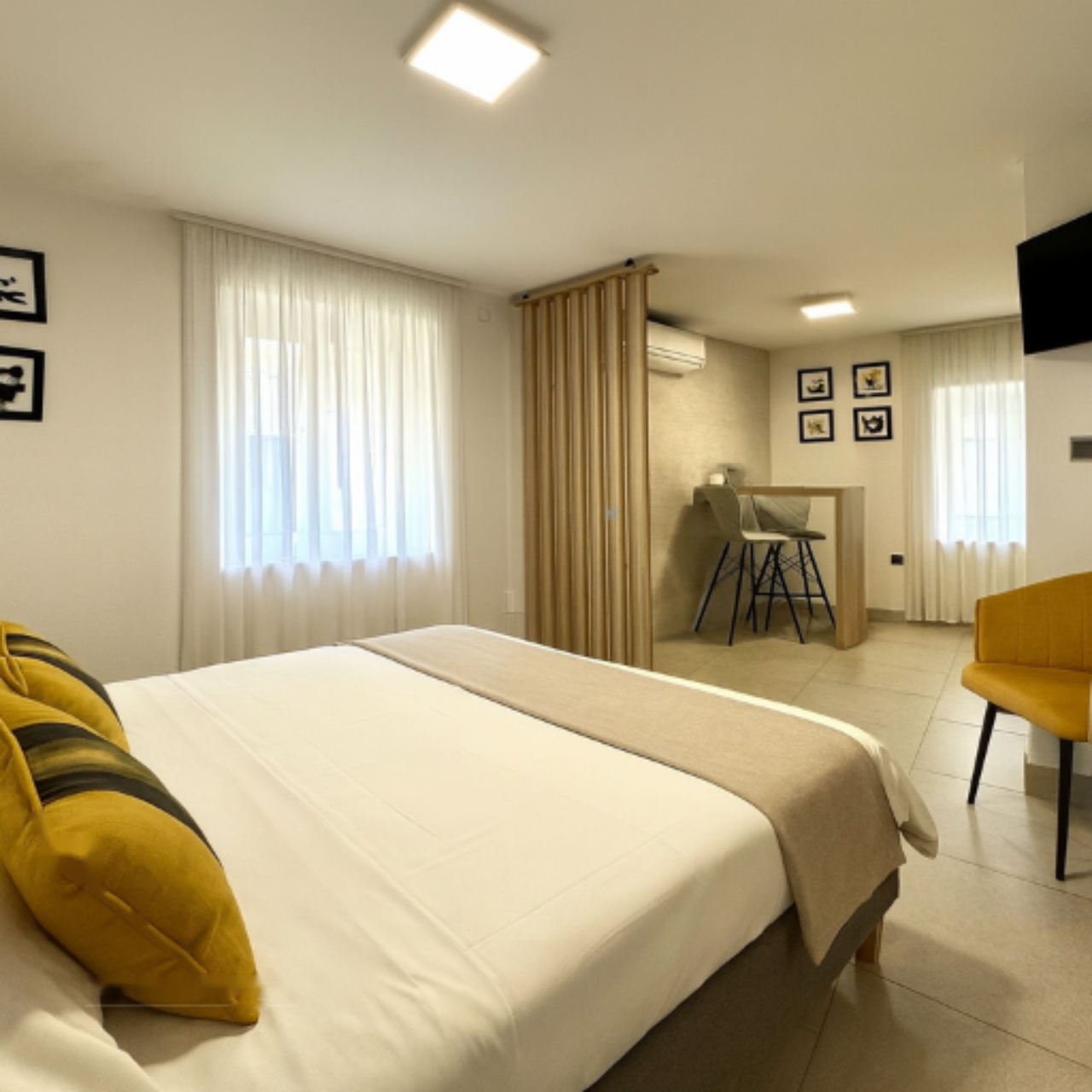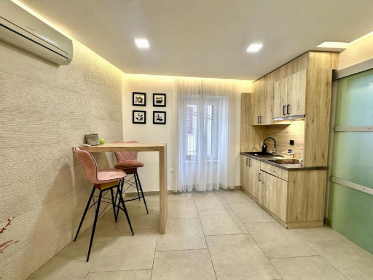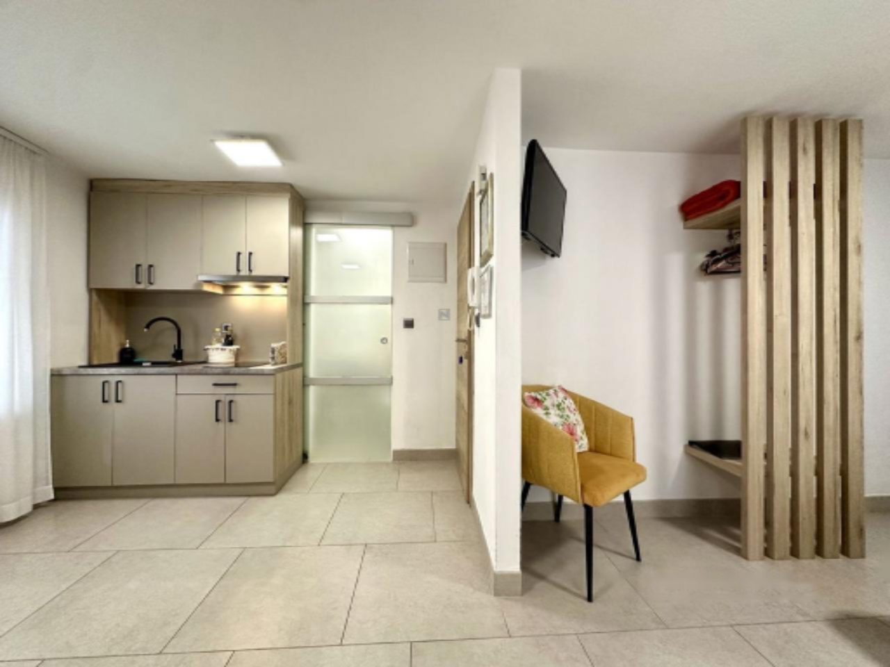 Дом включает: первый этаж, второй этаж, третий этаж и мансарду. На каждом этаже расположен отдельный апартамент, а мансарда предлагает уютную террасу и небольшое помещение для хранения. Три светлых апартамента, каждый площадью около 25 м², содержат спальную зону, кухню с обеденной зоной и ванную комнату. Два окна в каждом апартаменте обеспечивают обилие естественного света.