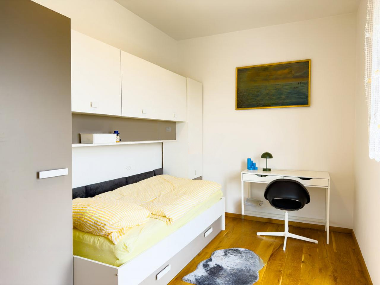 Дом предлагает комфортное проживание для семьи. На первом этаже расположены прихожая, техническое помещение, небольшая комната, которая может быть использована как кабинет или кладовая, кухня с обеденной зоной и просторная гостиная с выходом на террасу. Также на этом уровне находятся спальня с выходом в сад и собственная ванная комната. Второй этаж включает большую ванную комнату, спальню и две детские комнаты. Большие стеклянные окна обеспечивают достаточное естественное освещение.