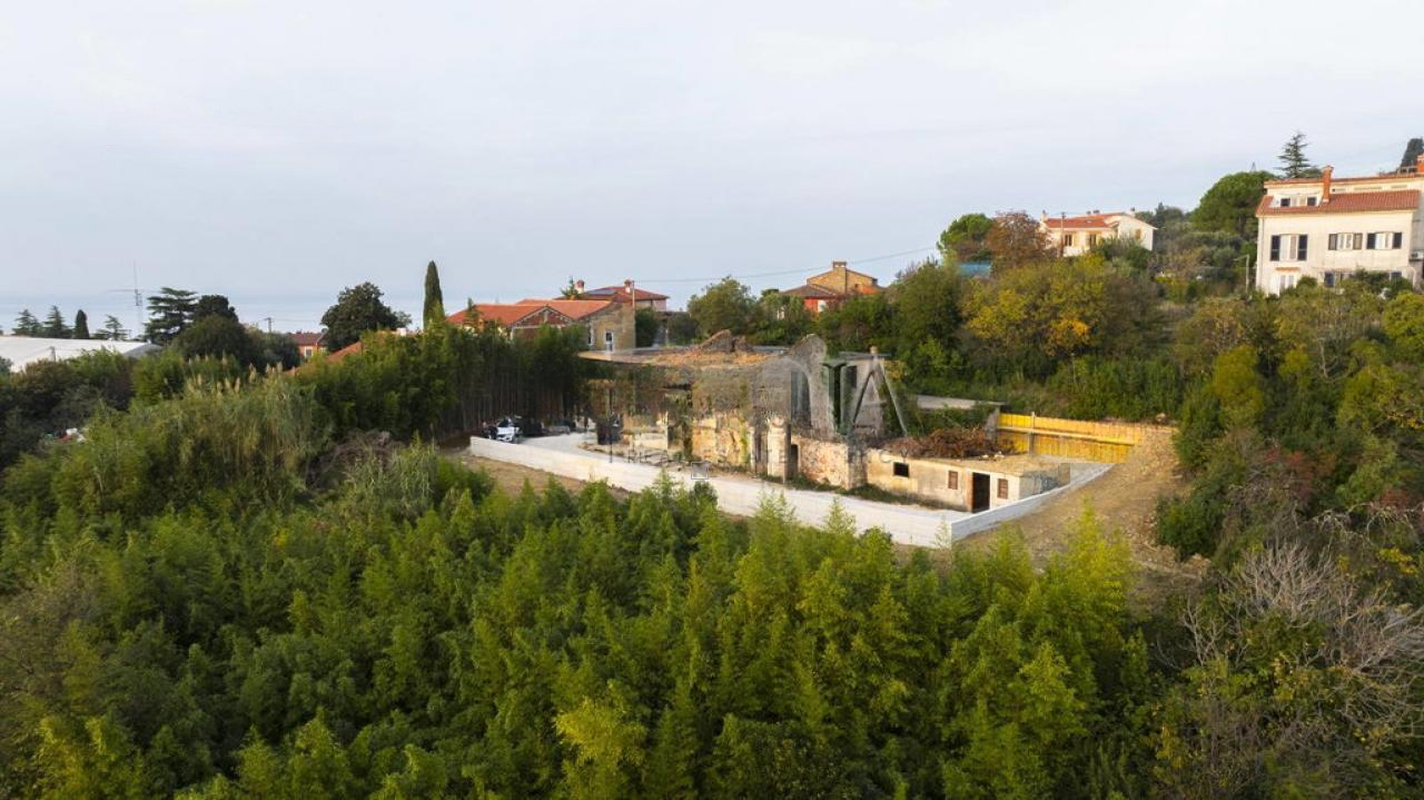 Продается эксклюзивное владение в Портороже площадью 386,7 м², расположенное на участке 811 м², с потрясающим видом на Порторож, Луцию, Красный Холм и Савудрию. Основное здание с правой стороны площадью 85,5 м² было построено в 1900 году и является законным строением. Крупное здание с левой стороны площадью 301,2 м² возведено в 1972 году, однако не имеет необходимых разрешений. Оба строения требуют сноса.