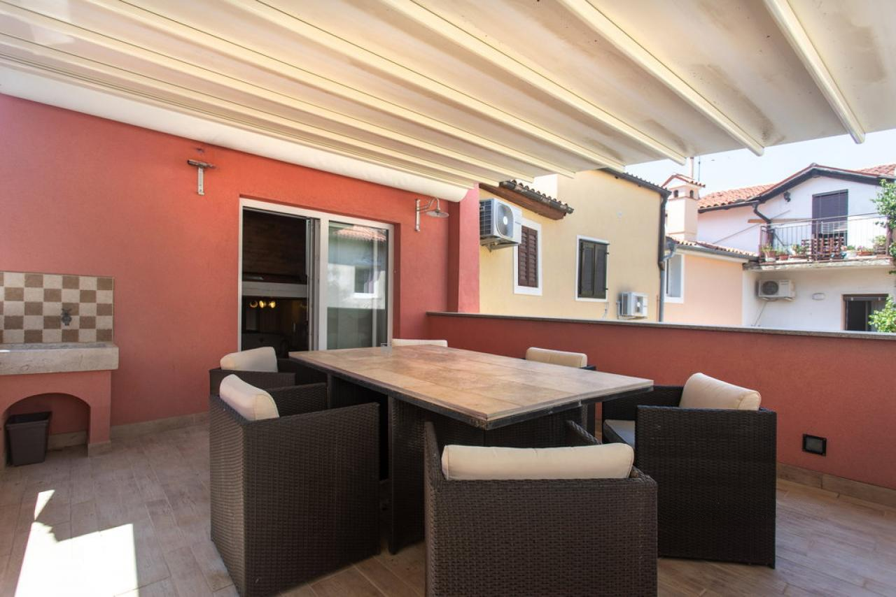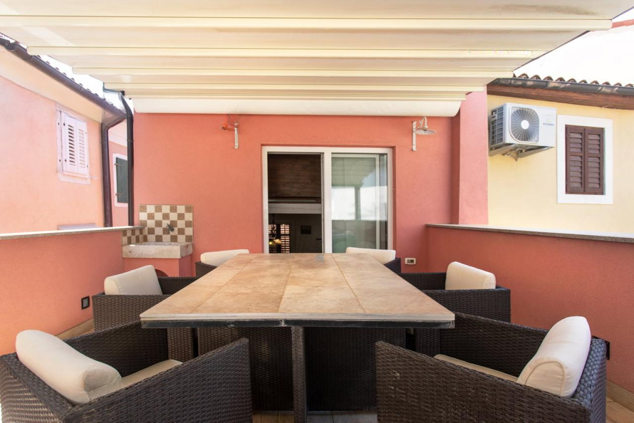 Терраса — настоящая жемчужина этой недвижимости, отлично подходящая для отдыха или дружеских вечеров. Она укомплектована большим столом, тентом и имеет необходимые подключения.