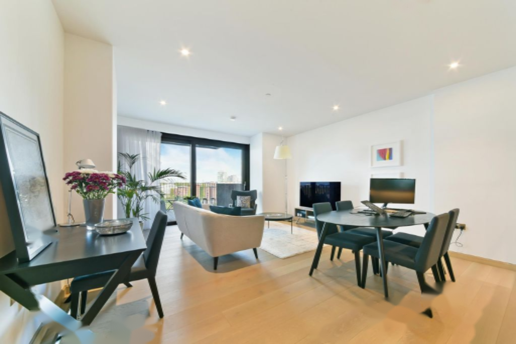 Часть популярного проекта Embassy Gardens, эта светлая и просторная квартира с одной спальней и кабинетом расположена на 6-м этаже нового здания Legacy Building 3. Она включает в себя просторный балкон с прекрасными видами на посольство США и реку Темзу. Площадь составляет 910 кв. футов, и в ней имеется кухня-гостиная открытой планировки, спальня с встроенными шкафами и кабинет.